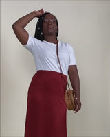 La jupe Nejma se porte longue, en taille haute, et s'adapte parfaitement à la morphologie de la femme grâce à sa coupe, son élasticité au niveau de la taille et sa fluidité.